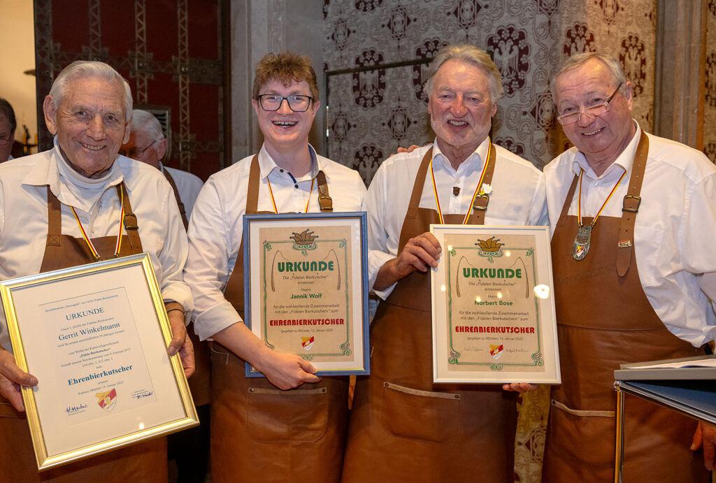 Neben den Ehrungen der Peitschenträger haben die fidelen Bierkutscher noch einige Ehrungen in ihren Reihen vorgenommen. Es wurden drei neue Ehrenbierkutscher ernannt, die entweder durch ihre bisherigen guten Taten oder die lange Zeit im Verein selbst, hervorgehoben werden sollten. Aber auch Ulrich Schäpers wurde für seine vielen Jahre Vereinsarbeit als Vorsitzender des MGV Rinkerode und nun auch der fidelen Bierkutscher geehrt.