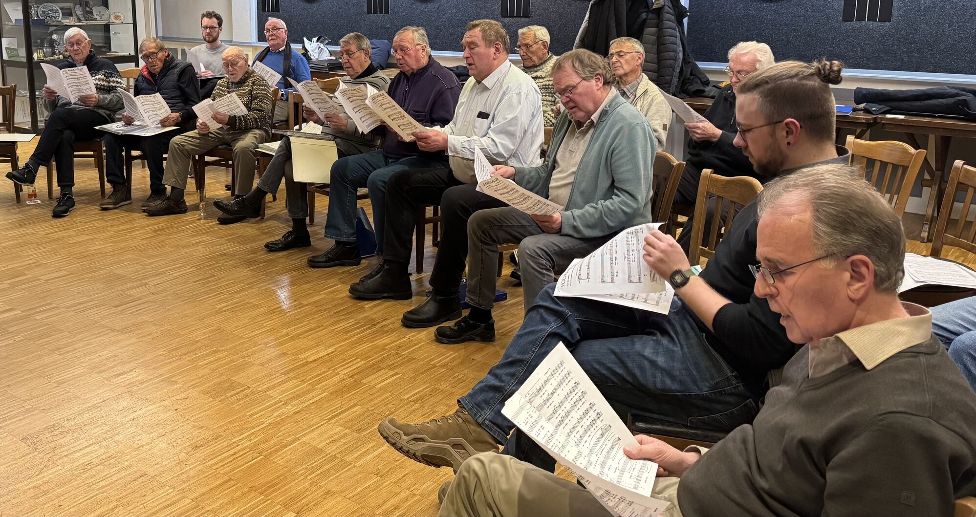 Unser Chor ist in vier Stimmen unterteilt – 1. Tenor, 2. Tenor, 1. Bass und 2. Bass. Es proben aber immer alle zusammen, auch wenn die Stücke natürlich auch in den Stimmen unterteilt, geprobt werden.